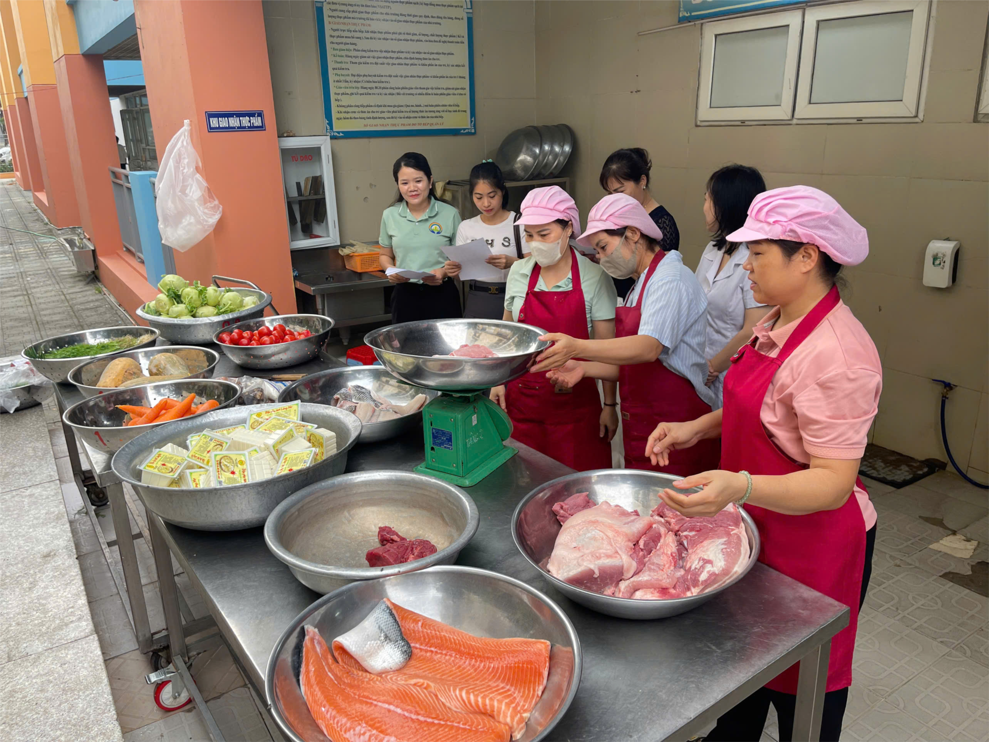 Mỗi buổi sáng, thực phẩm được các nhà cung cấp uy tín vận chuyển đến trường theo hợp đồng đã ký kết. Quy trình giao nhận được thực hiện chặt chẽ với sự tham gia của Ban giám hiệu, nhân viên nuôi dưỡng, bộ phận y tế và đặc biệt là đại diện phụ huynh học sinh. Sự tham gia của phụ huynh góp phần tăng cường tính công khai, minh bạch và tạo niềm tin đối với công tác chăm sóc, nuôi dưỡng trẻ tại nhà trường.